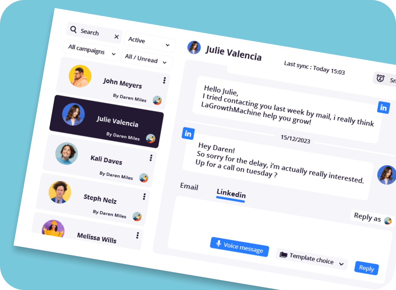 Elle centralise toutes vos conversations sur LinkedIn et vos emails en une seule vue. Gagnez du temps tout en gérant les réponses !