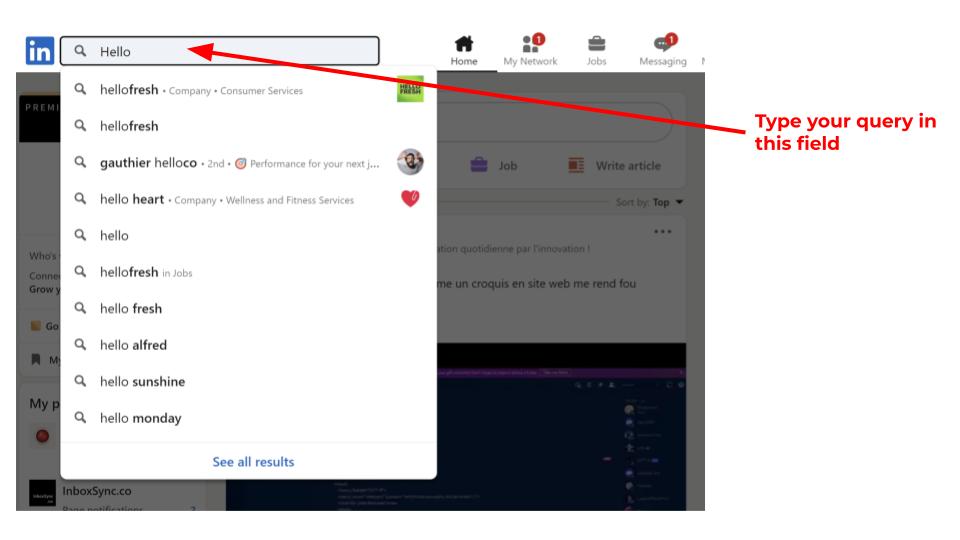 Pour accéder à la recherche avancée de LinkedIn, commencez par saisir une requête (un nom d’entreprise, par exemple) dans le champ de recherche de base, comme indiqué ci-dessus.