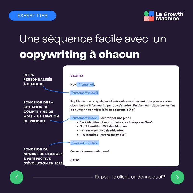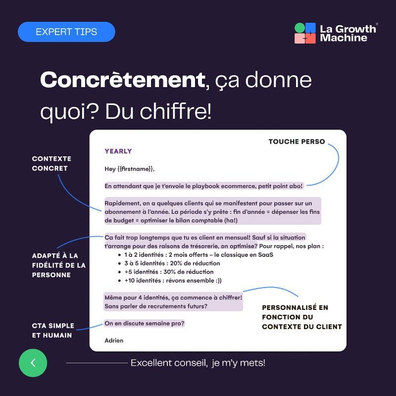 La personnalisation est cruciale. Visez à rédiger des messages qui résonnent avec la situation spécifique du client, ses niveaux de fidélité, son utilisation de la licence, etc.