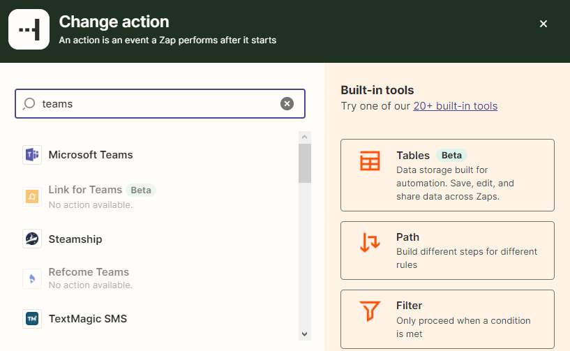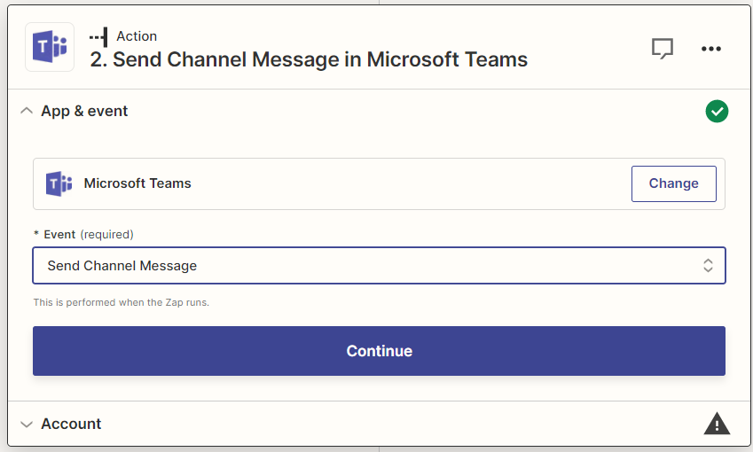 Ce Zap suit littéralement les mêmes étapes que celui de Slack, sauf que l’application d’action est Microsoft Teams à la place.