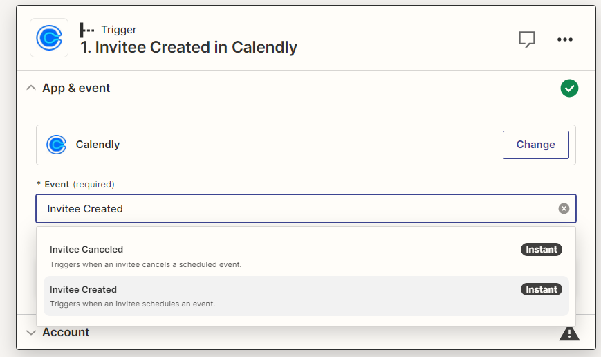 - Étape 2 : Sélectionnez « Invitee Created in Calendly » comme déclencheur d’événement dans Calendly