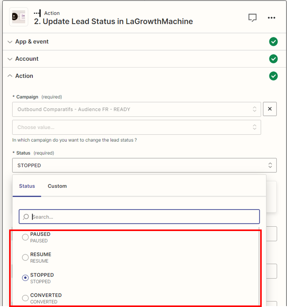 Puisque vous pouvez qualifier les leads sur La Growth Machine, mais seulement manuellement, les Zaps de cette section vous permettront de modifier automatiquement le statut de chaque lead en fonction de leur interaction avec votre campagne: