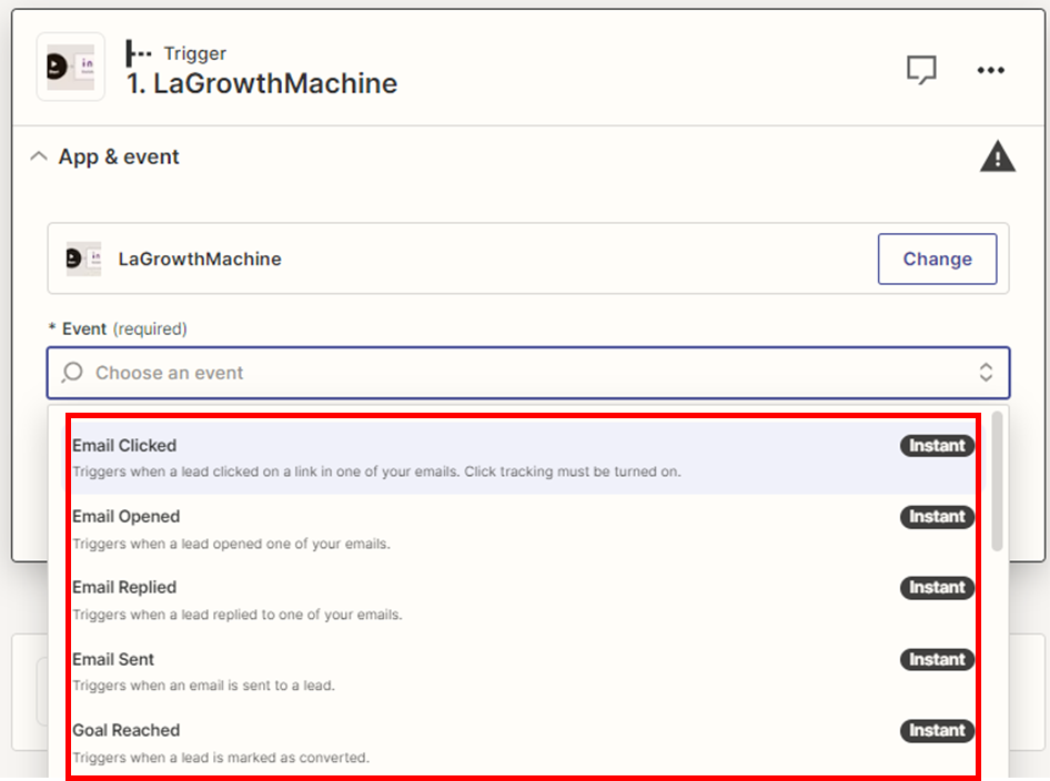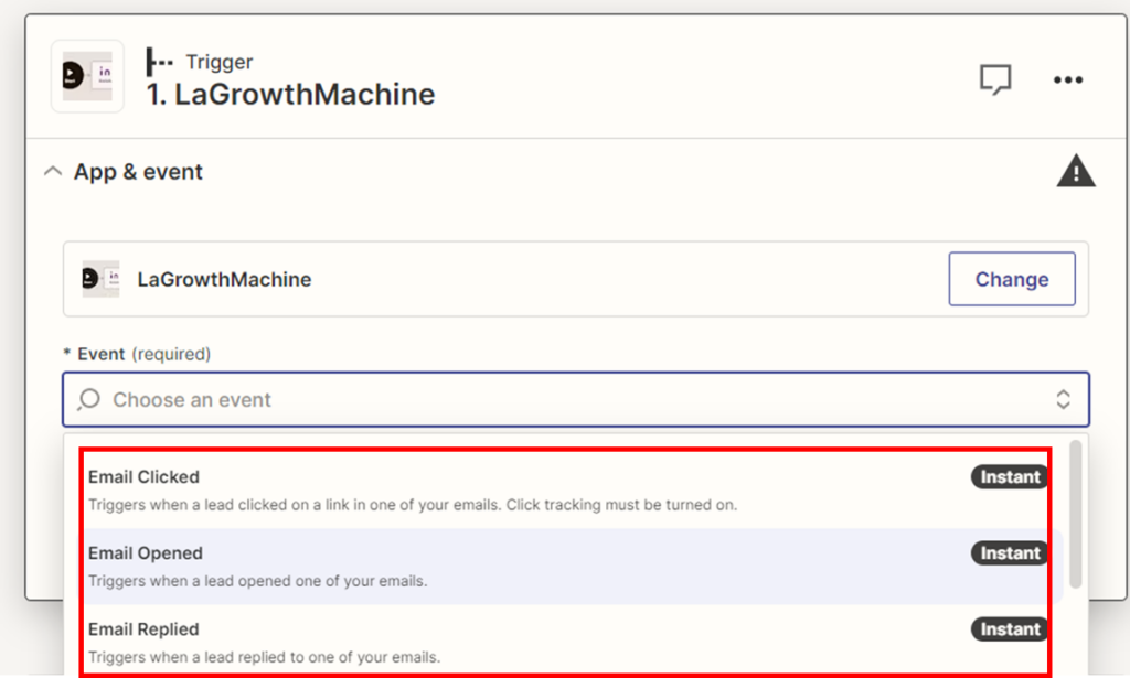- Étape 2 : Sélectionnez La Growth Machine comme « Trigger App » et choisissez l’un des événements déclencheurs. Dans ce cas, il s’agit de l’une des actions effectuées par un client potentiel :