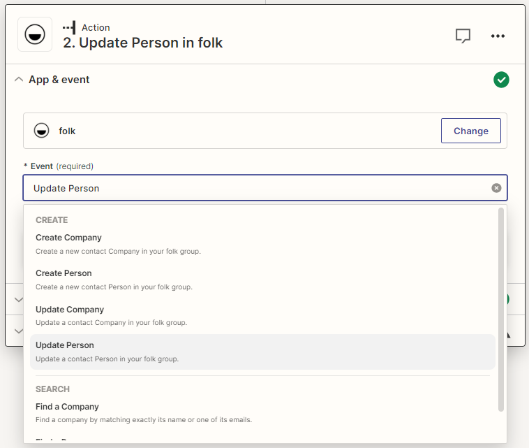 - Étape 5 : Sélectionnez « Update Person in fold ». (Vous pouvez également mettre à jour l’entreprise, en créer une nouvelle ou un nouveau profil de candidat, etc.)
