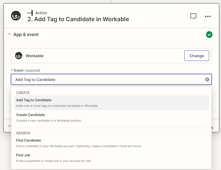 - Étape 4 : Sélectionnez « Add Tag to Candidate in Workable » et remplissez le reste des champs.