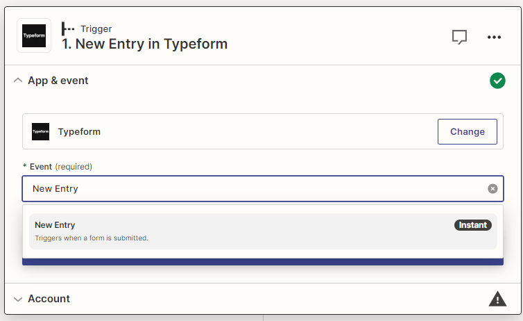 - Étape 2 : Vous n’avez qu’une seule option de déclenchement d’événement qui est « New Entry in Typeform », sélectionnez-la.