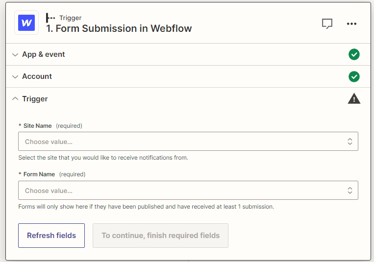 Encore une fois, il s’agit de la même chose que le Zap Typeform. La seule chose qui change est le nom de l’événement parce que Webflow est maintenant le déclencheur.