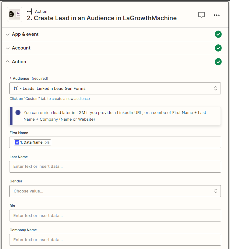- Étape 4 : Connectez votre compte La Growth Machine et sélectionnez « Créer un lead dans une audie »