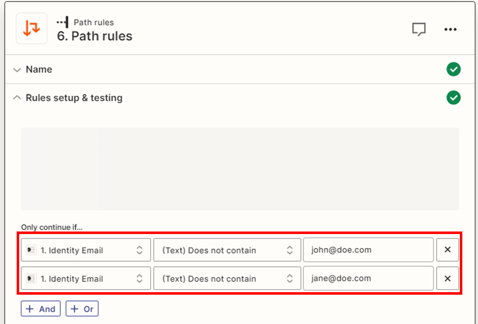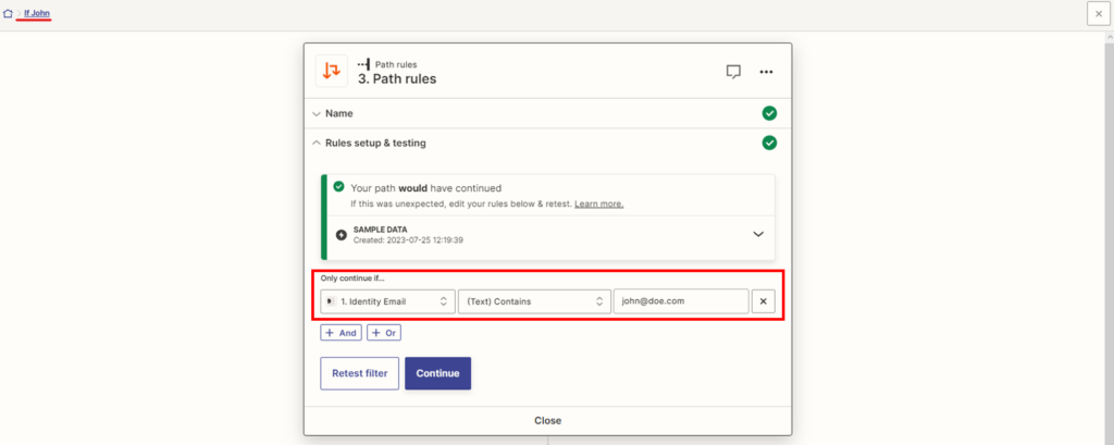 - Étape 5 : Dans les règles, vous spécifierez les conditions. Dans le cas présent : Ne continuez que si… Identity.email = [email protected]