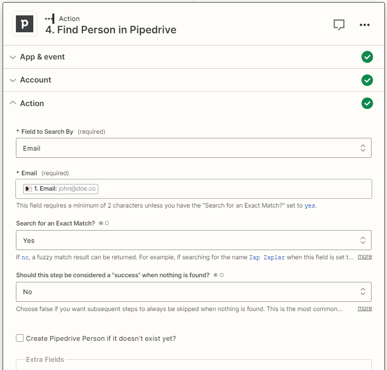 - Étape 7 : Connectez votre compte Pipedrive et sélectionnez « Find person in Pipedrive » comme action. Sélectionnez « Email » comme champ à rechercher pour Pipedrive. Il s’agit de l’email de votre lead, ce qui signifie qu’il provient de la première étape (Email Replied on La Growth Machine).