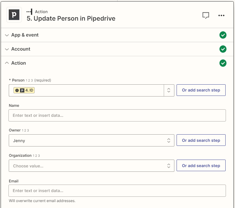 - Étape 9 : Nous devons maintenant mettre à jour ce lead pour changer son propriétaire. Pour cela, nous ajoutons une dernière étape « Update Person in Pipedrive » sur Pipedrive. Remplissez les champs obligatoires : Personne (ces données proviennent de la dernière étape où nous avons « trouvé » la personne) et Propriétaire spécifiquement. (Le propriétaire est une valeur fixe que vous devrez choisir dans une liste, dans notre exemple, il s’agirait de « John Doe »)