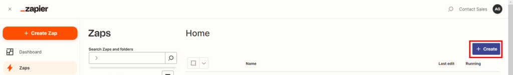 - Étape 1 : Sur votre page d’accueil Zapier, cliquez sur « Create »
