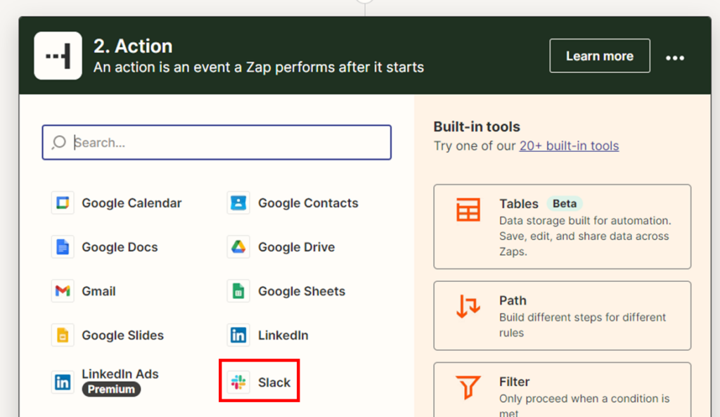 - Étape 3 : Sélectionnez Slack comme application d’action.