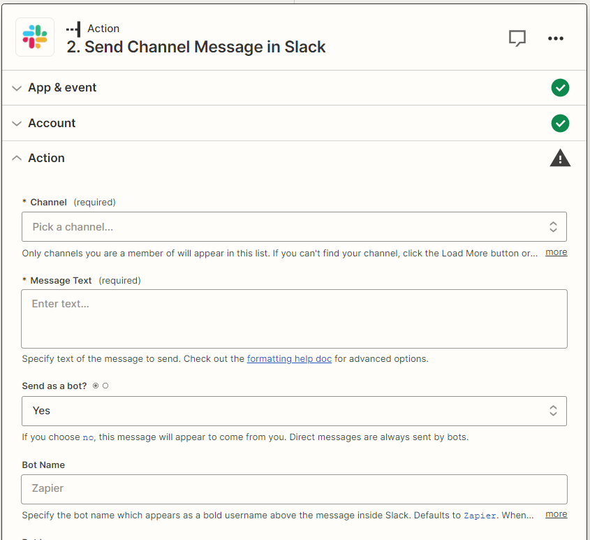 - Étape 4 : Choisissez « Send Channel Message in Slack », sélectionnez le canal approprié, tapez le message souhaité et continuez à remplir le reste des actions.