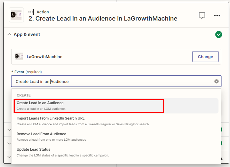 - Étape 4 : Connectez votre compte La Growth Machine et sélectionnez « Create Lead in Audience in La Growth Machine ».