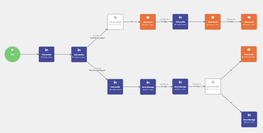 Thus, creating a sequence of messages that reaches them in a number of different platforms and ways is your best chance of reaching the right contacts no matter where they are online. With LaGrowthMachine, you can create a multi-channel flow that reaches out to your prospects in different places automatically.