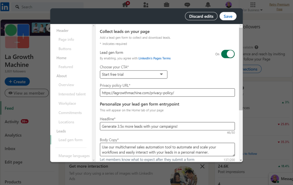 They also work hand in hand with LinkedIn Ads, meaning you can create a campaign within LinkedIn Ads and direct users to your lead gen form once they click.