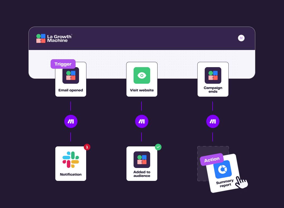 Set up triggers such as email opens or LinkedIn invitation acceptances, and pair them with automated actions: create a lead, update a status, or add a notification on Slack. Every interaction becomes an efficiently leveraged opportunity.