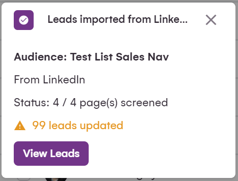 Once that’s done, the tool will take a couple of minutes to import the leads depending on how many there are. Once it’s done you’ll see this little notification in the bottom left corner: