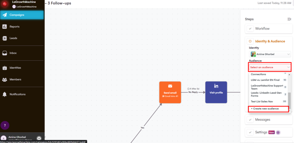 - Campaign Creation: If you’re starting from scratch, simply choose “Create New Audience.” This is where your well-segmented leads come into play. You can even select your LinkedIn identity for a personalized touch.
