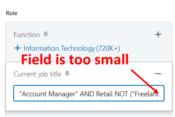 Search fields are way too small and you’ll quickly run out of space, especially as you use more and more advanced filters and operators.