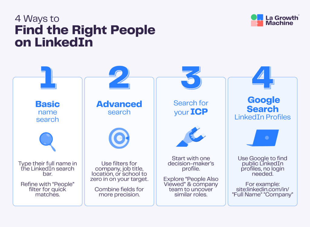 “Just search their name on LinkedIn” sounds simple enough, right? But if you’ve tried it, you know it’s not always that straightforward. Between privacy settings, countless John Smiths, and LinkedIn’s evolving search features, finding the right decision-makers who match your ideal customer profile can feel overwhelming.