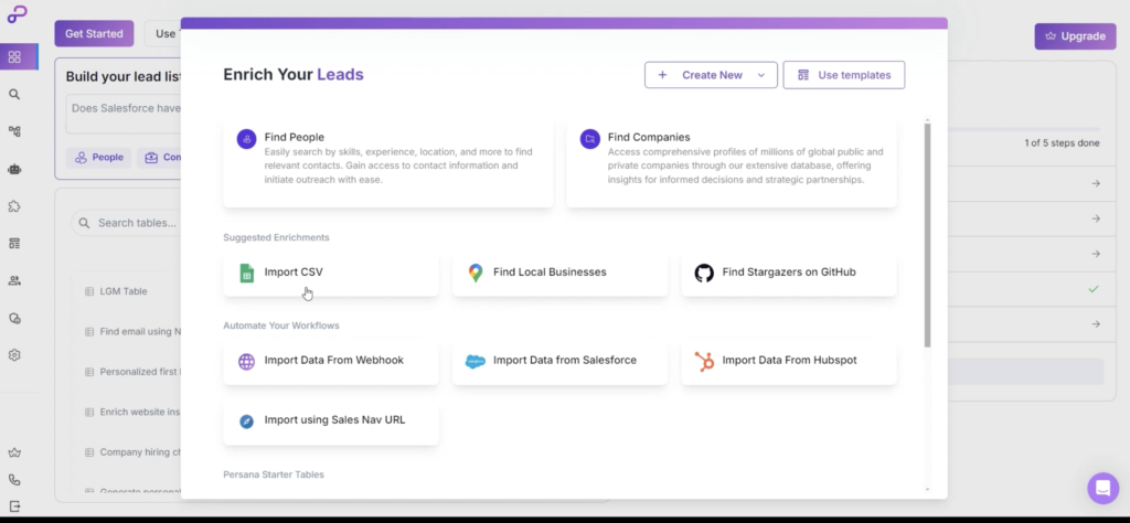 - Choose Import CSV (you can also start with People Search or Company Search).