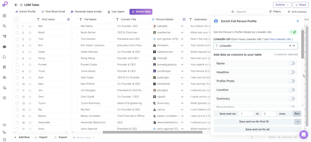 - Enrich prospect data: Get detailed information like job titles, industries, and skills.