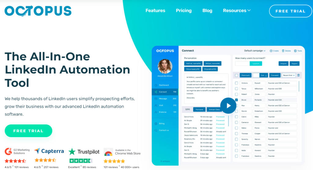 Se você está procurando uma ferramenta que seja uma extensão simples do Chrome, o Octopus pode ser uma boa opção para você experimentar. Ele funciona de forma semelhante ao Zopto, onde você pode extrair informações de seus contatos do LinkedIn e enviar mensagens a eles.