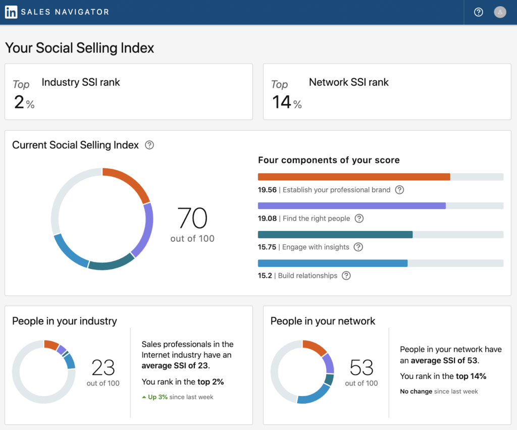 Uma ferramenta interessante com o LinkedIn Analytics é o Índice de Vendas Sociais (SSI). Enquanto estiver logado, abra este link. Ele fornecerá informações detalhadas sobre sua pontuação em termos de oportunidade de vender através do seu perfil.