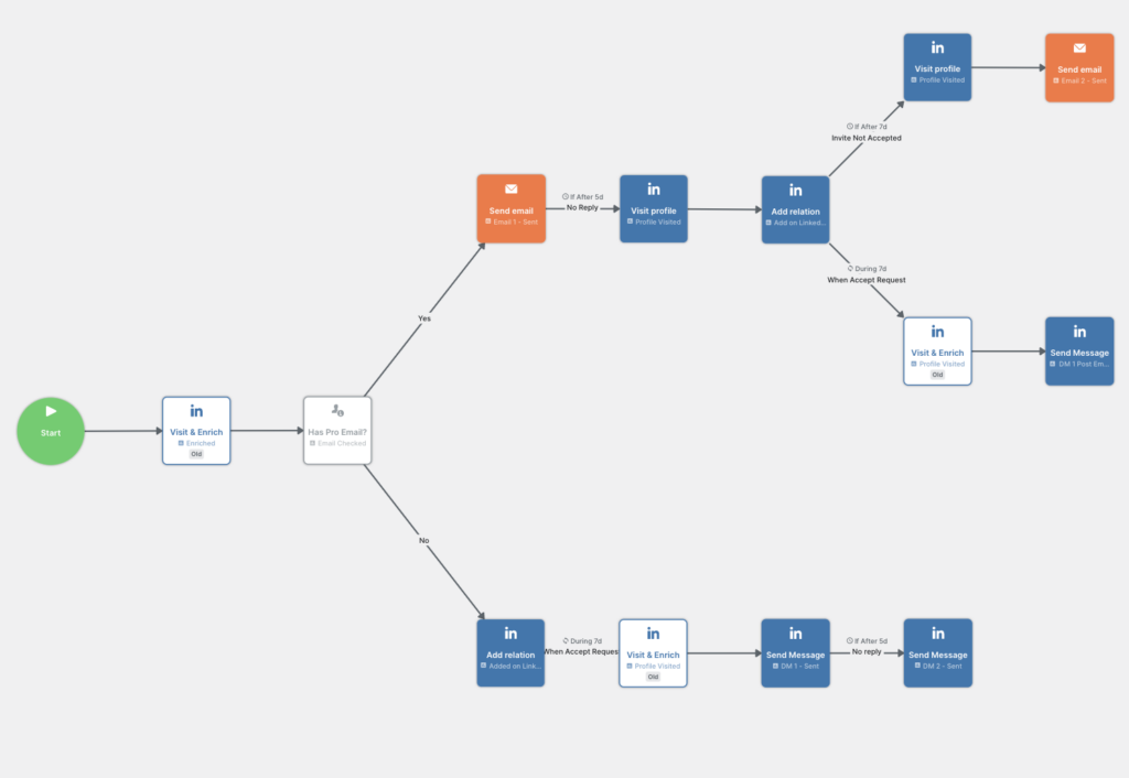 Outra maneira de usar seus insights de ‘visualizações’ é usar LaGrowthMachine para criar um fluxo de trabalho que permita contatar as pessoas com quem você deseja se conectar. Através de diferentes plataformas, você pode enviar uma mensagem para listas específicas em horários específicos.