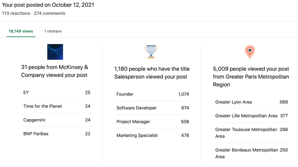 Se pessoas que você gostaria de contatar estão visualizando sua postagem, envie uma mensagem para a pessoa mais relevante da empresa e mencione o tópico que seria de interesse delas. (Não seja estranho e diga diretamente ‘ei, sei que você viu minha postagem’.) Observe também a localização, pois isso pode indicar que você deve concentrar seus esforços em uma região que se interessaria pelo que você faz.
