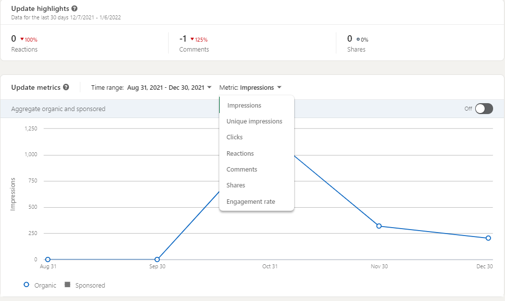 Na página da sua empresa, você também poderá encontrar as Análises de Atualizações, que fornecem uma visão geral de todas as postagens. Você pode filtrar por data e tipo de métrica, de Impressões a taxa de engajamento. Esta é a sua visão panorâmica para ajudá-lo a ver como você melhorou ou piorou ao longo do tempo.