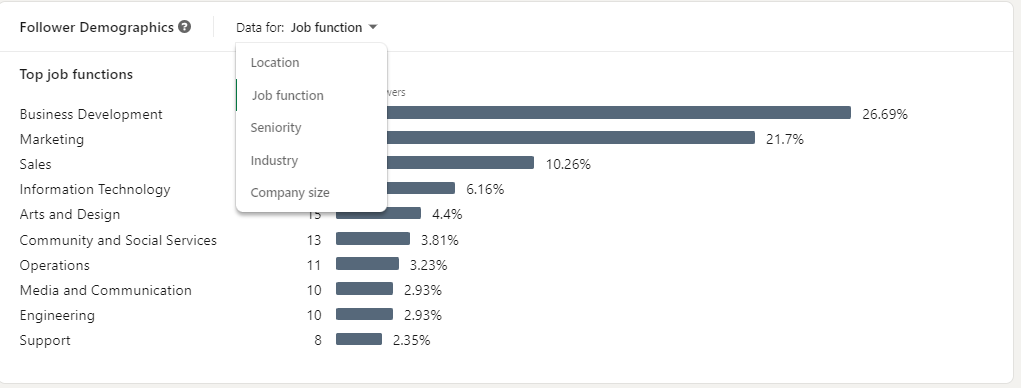 Use essas análises do LinkedIn para saber mais sobre quem segue sua empresa e isso lhe dirá que tipo de conteúdo você precisa criar para eles. Ou, isso lhe dirá que você está segmentando as pessoas erradas com o que diz e posta, e você pode começar a determinar onde pode fazer mudanças.