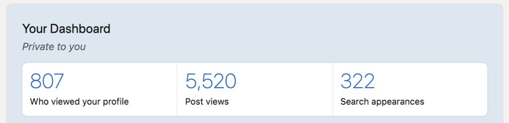 Semelhante à página da empresa, depois de ter um perfil completo, você vai querer começar a analisar suas postagens, quem visita seu perfil e quantas novas conexões você está fazendo. Na sua página de perfil, você encontrará seu painel pessoal perto do topo, que fornece alguns números úteis da semana anterior. Se você tiver uma conta LinkedIn Premium (a partir de US$ 29,99/mês), você também pode visualizar dados históricos.