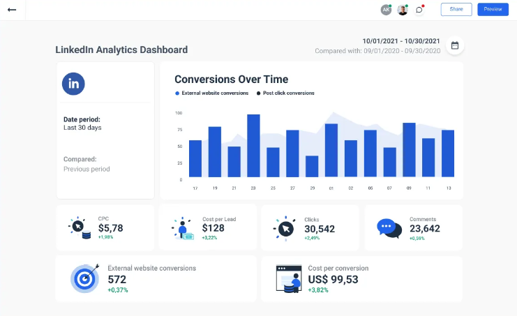 - Whatagraph – esta ferramenta pode ajudá-lo a organizar seus KPIs de mídia social em um só lugar e construir rapidamente uma análise detalhada do desempenho do seu perfil do LinkedIn. O modelo pré-fabricado inclui uma visão geral de desempenho, rastreamento do crescimento de seus seguidores no LinkedIn ou visualização de todo o funil de engajamento.