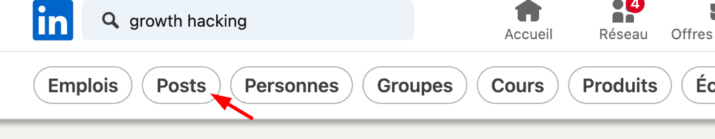 Simplesmente digite as palavras-chave de seu interesse na barra de pesquisa do LinkedIn e escolha Posts: