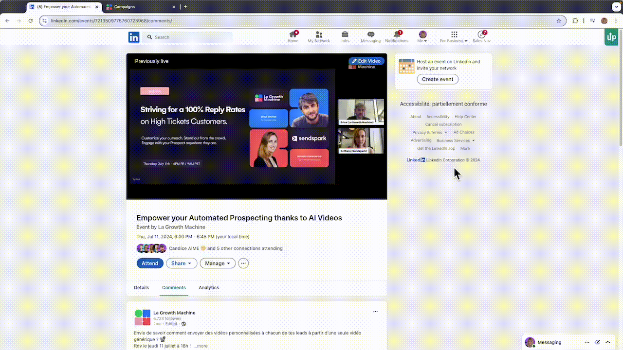 Raspe todos os prospects que reagiram a uma ou mais de suas publicações (usando o La Growth Machine, por exemplo), e crie uma campanha de 2 mensagens privadas no LinkedIn.