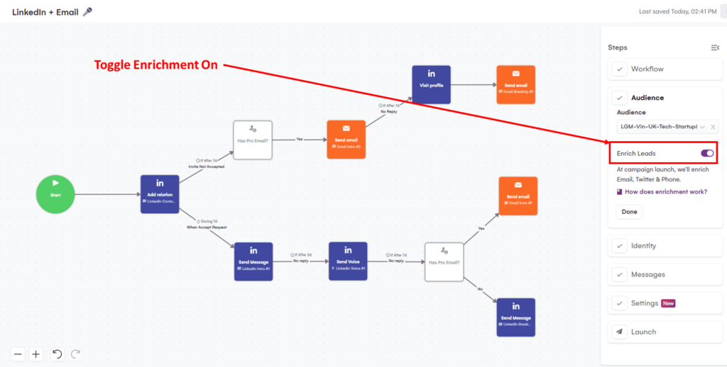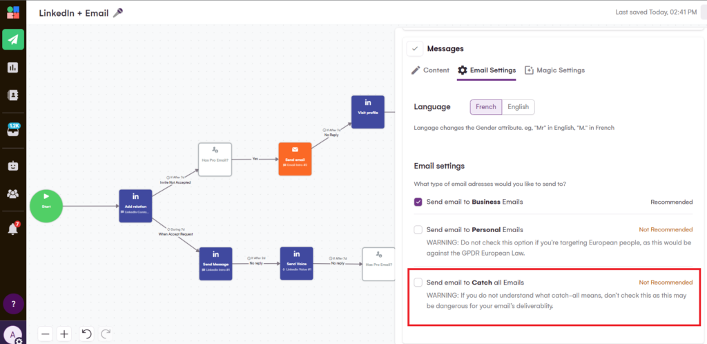 Se você está usando o e-mail primeiro porque acredita que seus leads têm maior probabilidade de responder por e-mail em vez de LinkedIn, e sua taxa de enriquecimento é insatisfatória, então ative os e-mails catch-all.