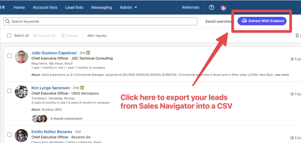 2. Usando uma extensão do Chrome: como a Evaboot, se você estiver usando o Sales Navigator, que é ótimo para fazer “seleção”. Basicamente, você só precisa fazer login no LinkedIn, visitar um perfil, clicar na extensão e ela extrairá o endereço de e-mail do seu lead.