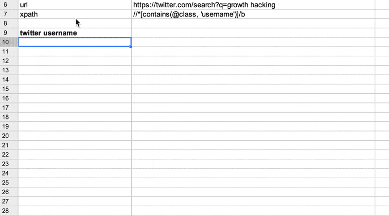 =IMPORTXML(“https://www.linkedin.com/in/johndoe”, “//div[@class=’email’]”)
