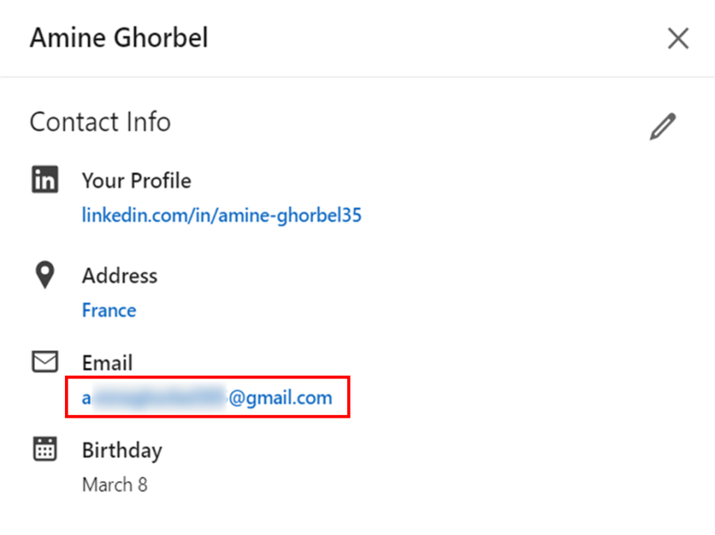 É graças ao LinkedIn! De acordo com nossos dados internos, 80% dos perfis do LinkedIn exibem seus e-mails (aquele que usaram para criar sua conta do LinkedIn) para seus contatos.