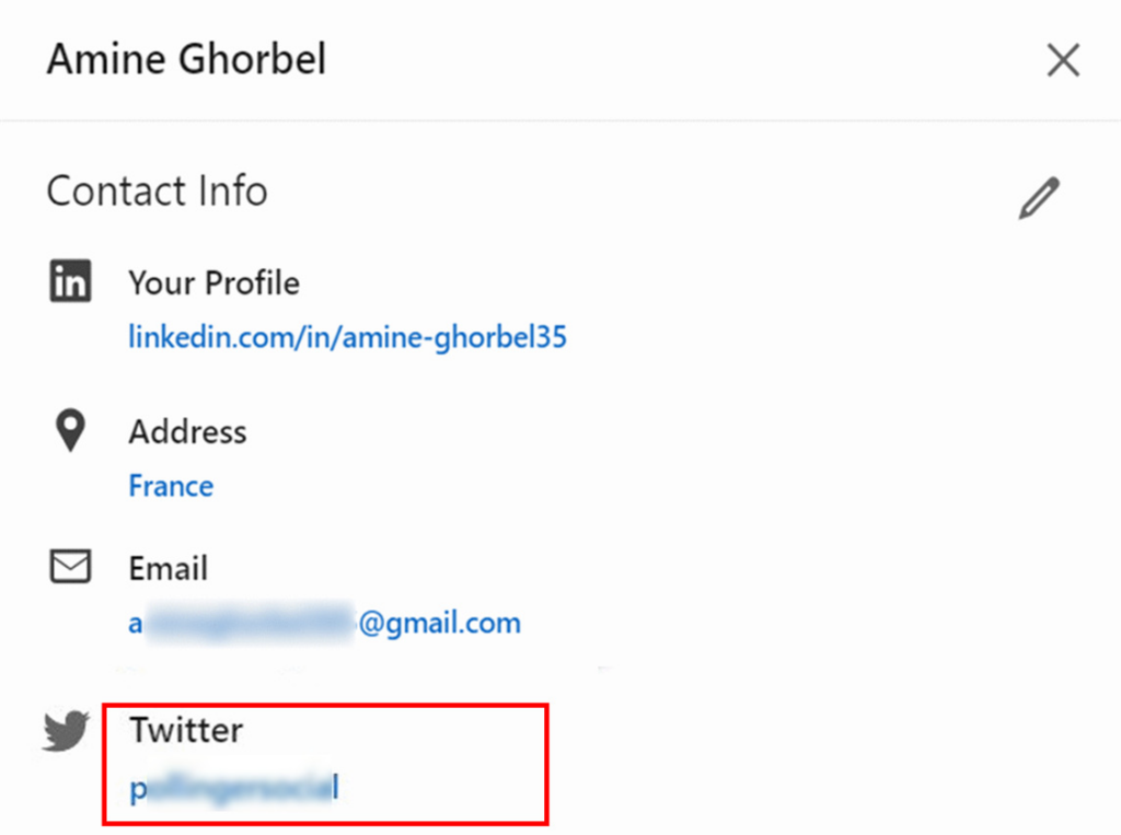Se o lead não listar nenhuma conta do Twitter em seu perfil do LinkedIn, o LGM a procurará automaticamente diretamente no Twitter usando a combinação Primeiro Nome + Sobrenome + Nome da Empresa.