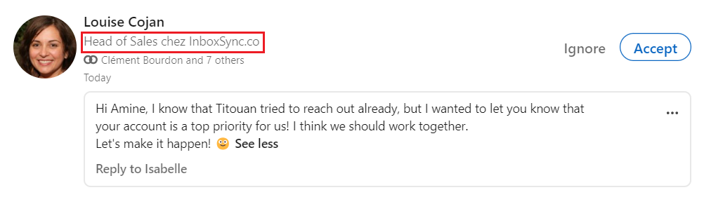- Comece com o LinkedIn: …e tente permanecer nele! Este é o elemento chave desta estratégia. A beleza do LinkedIn é que, com cada pedido de conexão, você exibe seu título. Aqui o “Head de Vendas” se destaca claramente, e se o lead quiser saber mais sobre você, ele pode simplesmente verificar seu perfil. Portanto, não se esqueça de otimizar seu perfil no LinkedIn!
