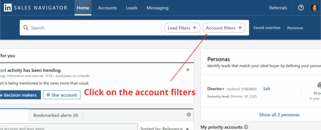 - Ir ao LinkedIn Sales Navigator, na aba “+ Filtros de Conta“;