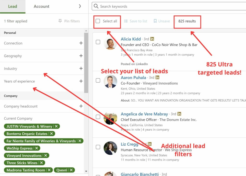 E é isso. Você obterá uma lista de vinícolas pequenas/médias nos EUA que estão indo bem e tentando expandir, obtendo mais orçamento e/ou recrutando novos talentos em marketing.