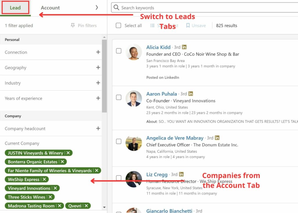 - Volte para sua lista de contas no LinkedIn Sales Navigator. Observe que você pode salvar suas listas de leads/contas se precisar voltar a elas mais tarde.