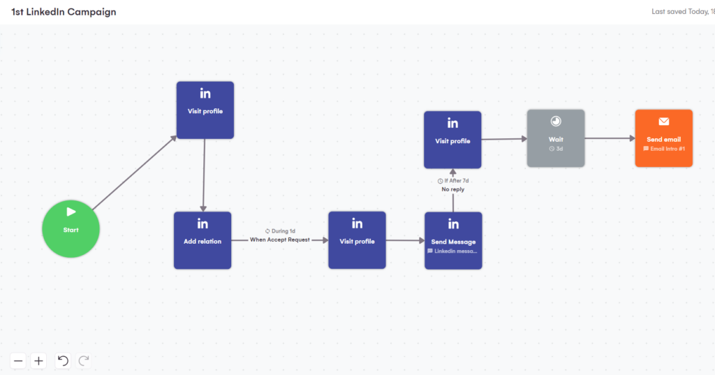 Quando você inicia uma sequência multicanal com a LaGrowthMachine, não importa quais canais você use, a primeira ação é sempre “Visitar Perfil” (você começa visitando o perfil do seu lead no LinkedIn, e sim, mesmo que você esteja fazendo campanhas apenas por e-mail).
