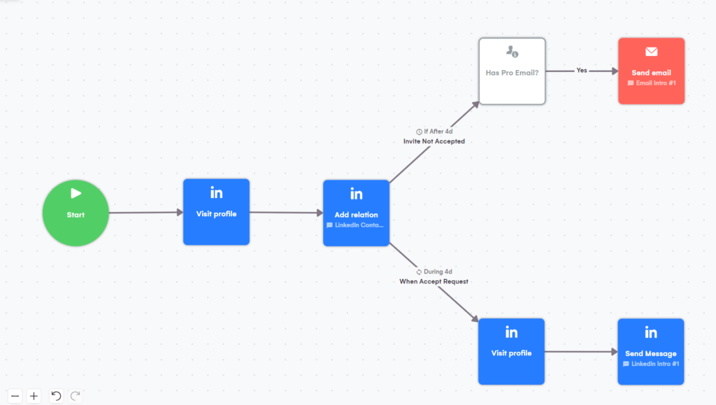 ** Você pode brincar com o número de dias que espera antes de passar para a próxima ação. Se seu público-alvo usa o LinkedIn com frequência, reduza para 3 dias, pois eles provavelmente não o aceitarão depois disso. Pelo contrário, se eles raramente usam a plataforma, espere até 14 dias antes de mudar para o e-mail.